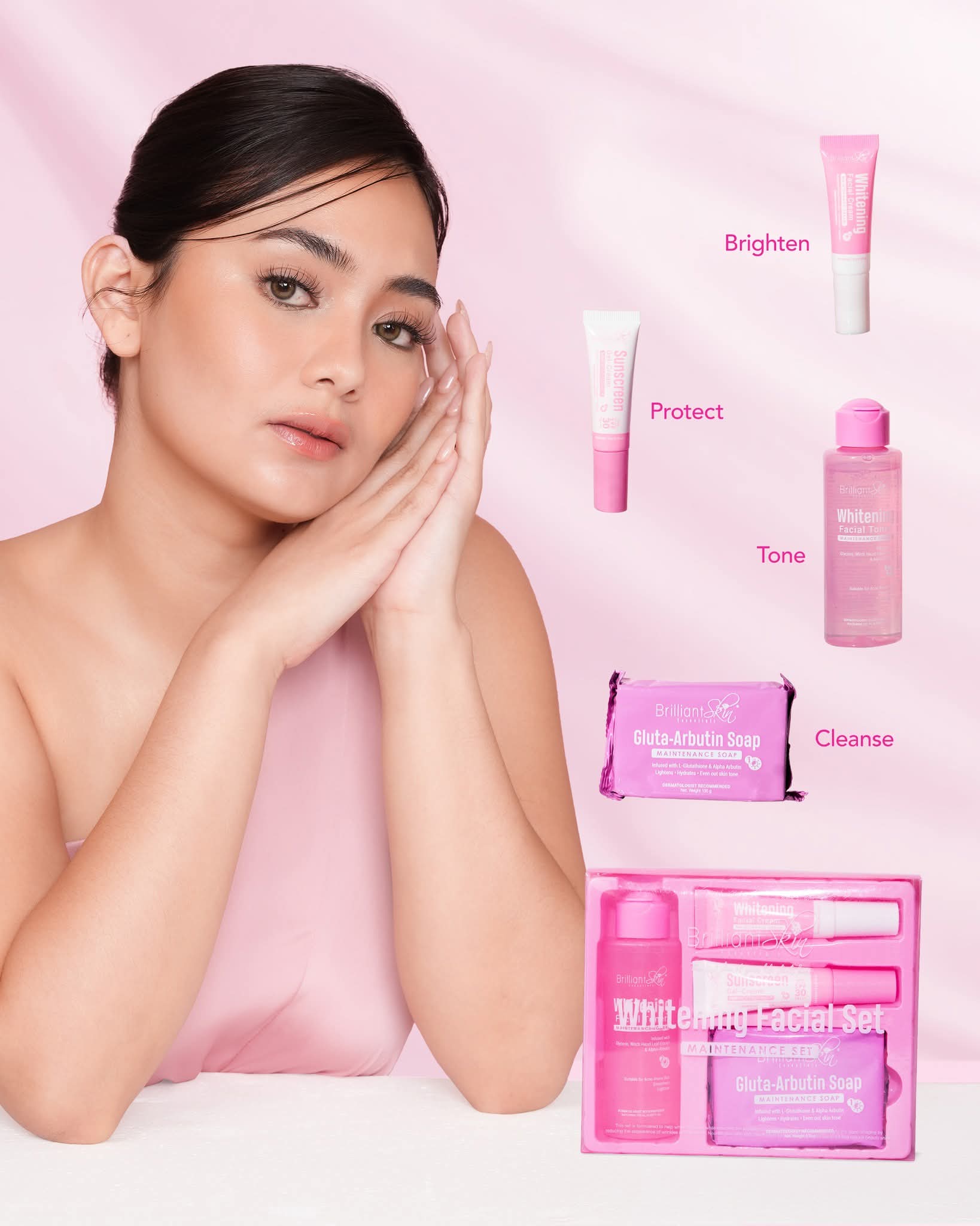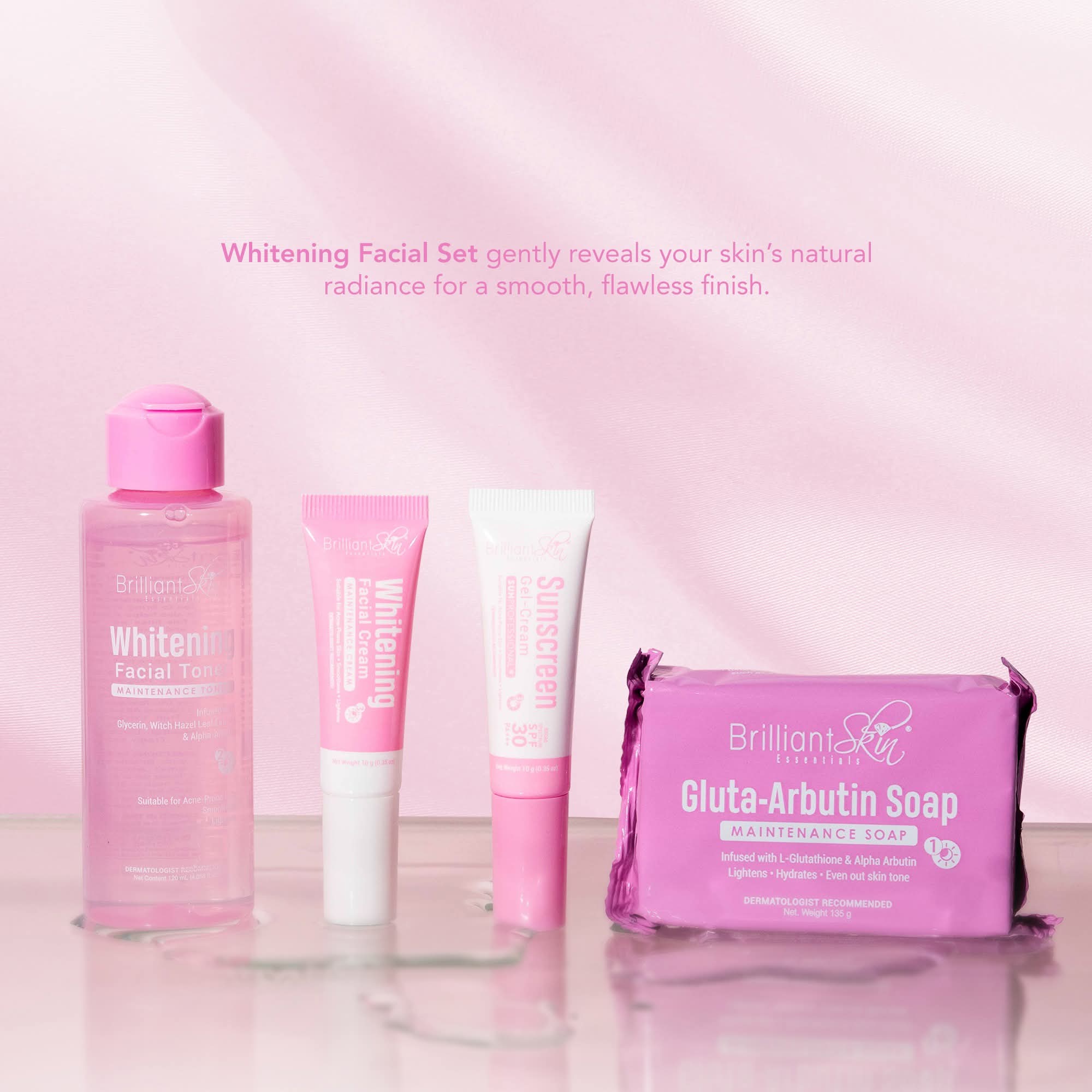 The Brilliant Skin Whitening Facial Set is designed to brighten and rejuvenate the skin, targeting dark spots, blemishes, and signs of aging. It aims to promote a more radiant complexion by gently exfoliating and nourishing the skin with key ingredients like Glutathione and Arbutin. The set typically includes a soap, toner, bleaching cream, and sunscreen.